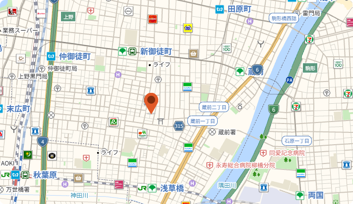 都営浅草線蔵前駅A3を出て、歩いて約8分。 JR総武線浅草橋駅西口を出て、歩いて約10分。